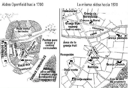 Uno de los procesos de modernización de la agricultura inglesa durante los siglos XVIII y XIX estuvo provocado por los cambios en la propiedad agraria. El paisaje típico inglés hasta ese momento estaba dominado por los campos abiertos (openfield), estructura de la propiedad que respondía a una explotación colectiva en la que cada campesino tenía acceso a unas parcelas de tierra para su cultivo (pero no tenía derecho de propiedad). Estas parcelas estaban dispersas por los alrededores de la aldea y el ganado tenía acceso a ellas al no estar valladas. Su productividad era baja y, en general, solo permitían una economía de subsistencia.