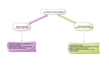 Mapa conceptual sobre la crisis del Antiguo Régimen en España. Ten en cuenta que esta crisis se desarrolla a caballo entre el siglo XVIII y el XIX, aunque hunde sus raíces en el siglo dieciochesco; por ello distinguimos entre causas a largo plazo, o estructurales, y causas coyunturales.