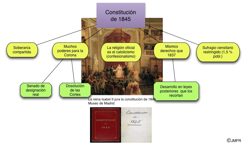 La Constitución de 1845 orientó la creación del modelo de liberalismo moderado que se implantó en España a partir de esta década. Muchos de sus preceptos fueron desarrollados después mediante leyes de signo aún más conservador. El siguiente mapa conceptual presenta sus rasgos fundamentales.