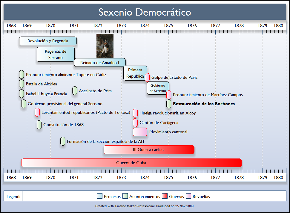 El período cronológico del Sexenio Democrático es corto temporalmente pero denso en acontecimientos y cambios. Para ayudarnos a comprender mejor esta etapa es muy conveniente utilizar un eje cronológico.