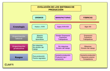 La primera Revolución Industrial transformó la manera de trabajar y de producir bienes de una forma radical. La introducción de la fábrica como lugar en el que se concentran las máquinas y los trabajadores, en el que el trabajo de estos se organiza según horarios y funciones a través de una división técnica, con un disciplina bastante dura, rompió la manera de trabajar propia de los gremios o de las tareas agrícolas. No obstante, las formas de producción habían registrado ya algunos cambios durante el siglo XVIII; estos cambios consistieron en la introducción de la manufactura. El siguiente mapa conceptual pretende explicar la evolución de las formas de producción desde el gremio medieval hasta la fábrica.