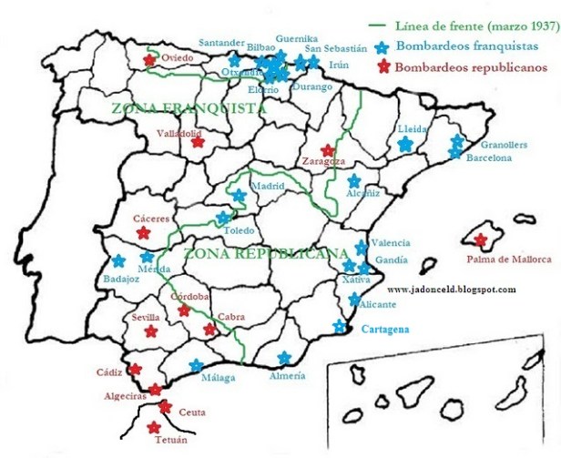 En muchos aspectos el conflicto bélico español fue antesala de lo que ocurrió después en la Segunda Guerra Mundial. Uno de esos aspectos fue el de las estrategias militares. Se inauguró en España la táctica de los bombardeos aéreos indiscriminados sobre ciudades situadas en la retaguardia; no se perseguía la destrucción de objetivos militares –cuarteles, arsenales, nudos de comunicaciones, puertos, aeropuertos, etc.– sino atacar a la población civil pera lograr la desmoralización del enemigo.