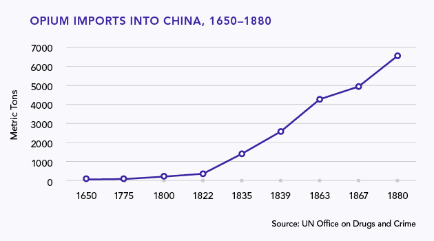El problema residía en que el comercio del opio no era inocuo. En China se conocía la droga por sus efectos medicinales, pero su uso era escaso. Sin embargo, el aumento del contrabando favoreció la expansión del consumo lo que contribuía a aumentar la adicción a esta sustancia entre su población. De este modo, su consumo se convirtió en un problema social al aumentar el número de adictos. También comenzaba a ser un problema económico, pues creaba un déficit comercial con Gran Bretaña, hasta entonces inexistente. Y todo ello a pesar de que desde 1796 diversos decretos prohibían tanto el tráfico como el consumo. En 1821 el gobierno chino decidió expulsar de Cantón –el puerto por donde llegaba el tráfico de opio– a todos los traficantes.